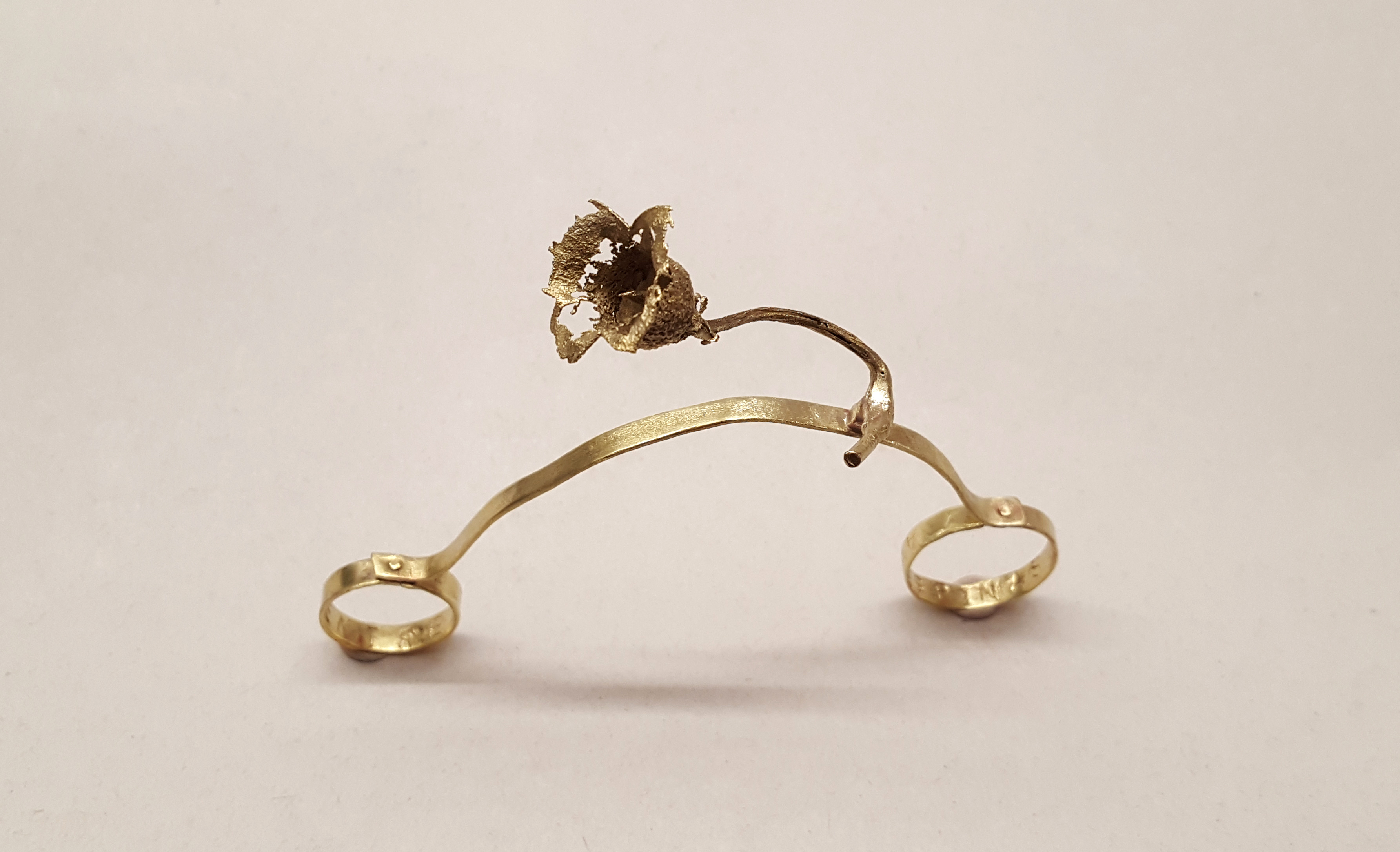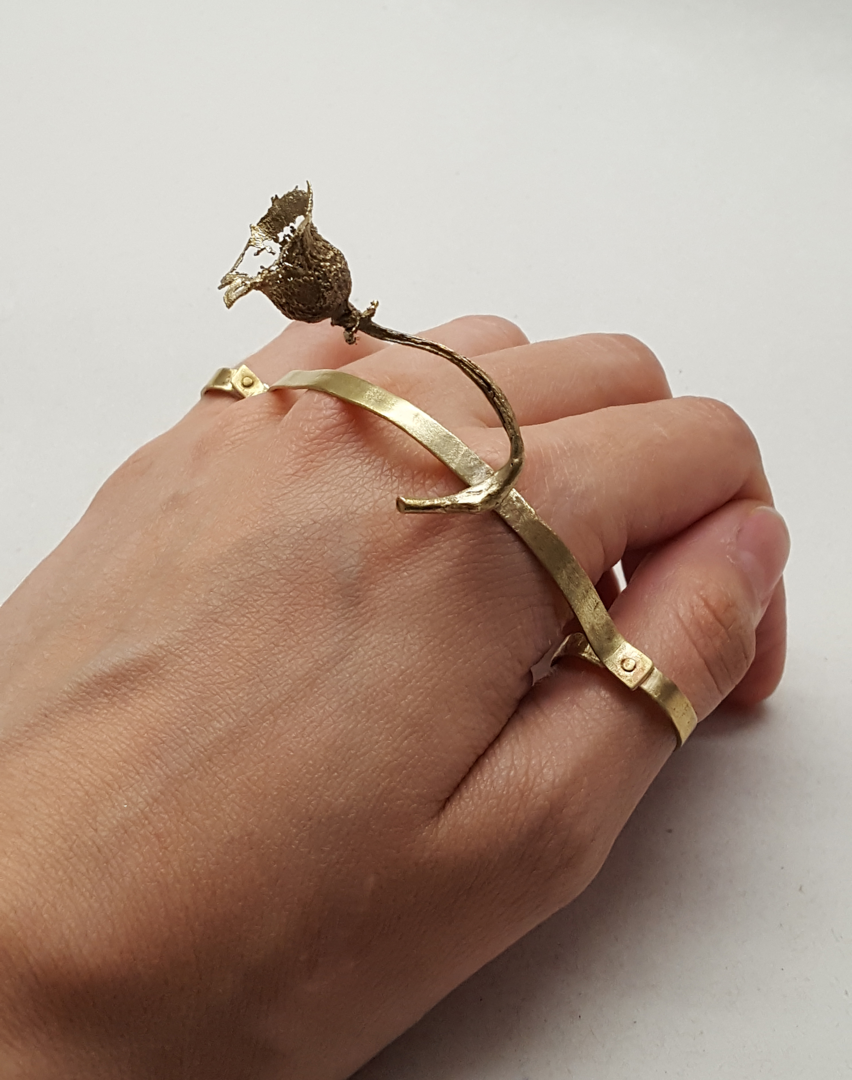 Anillos unidos por remaches móviles que desafían las convenciones, redefiniendo la relación entre la joya y el cuerpo.