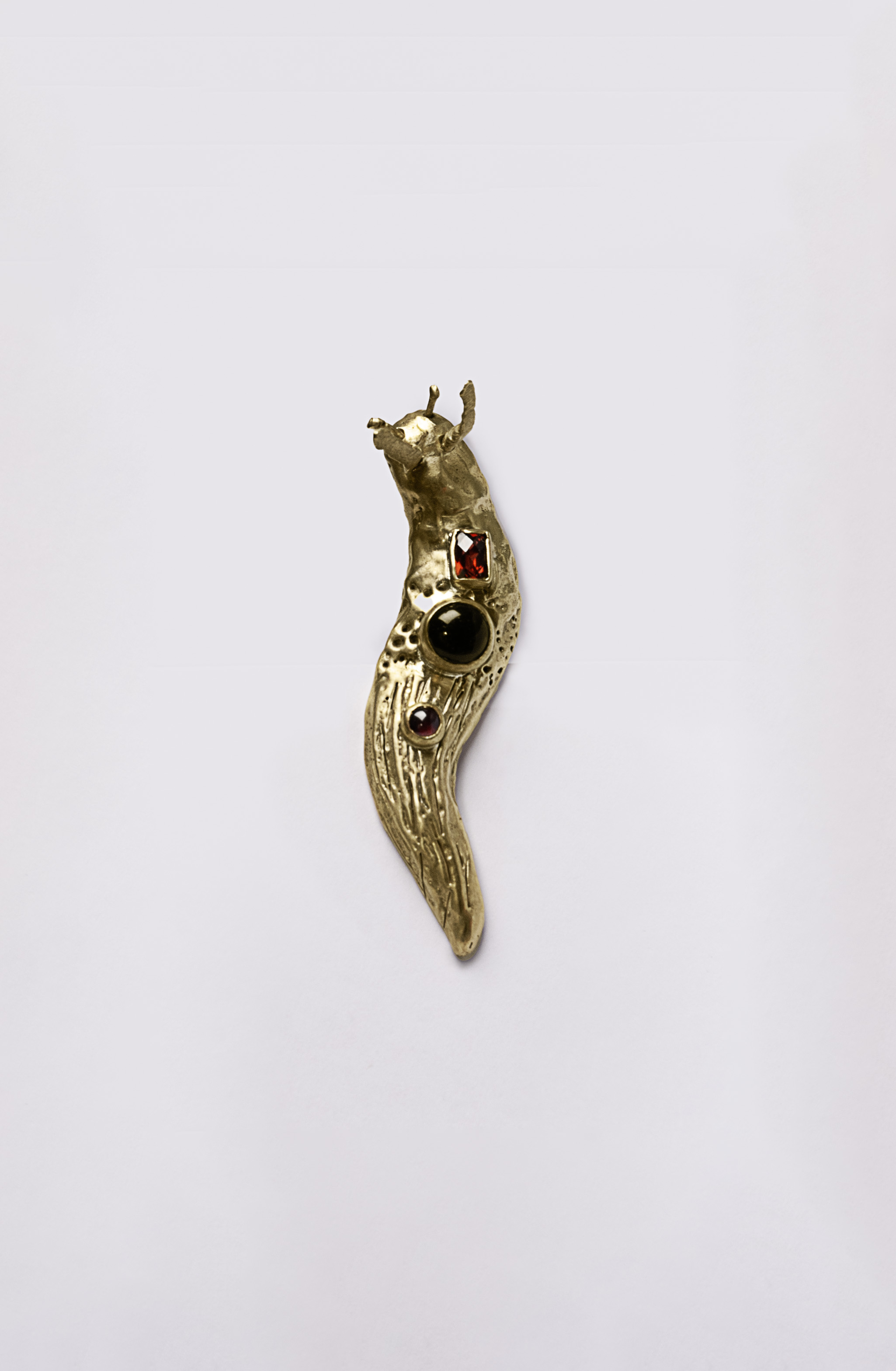 "The ugly repels the evil impulse." According to medieval lore, the garnet warns its owner of approaching danger and trouble by changing color. This power is doubled because both garnets and a black onyx are set in a slug, a monstrous mollusk that crawls and carries all that is evil.