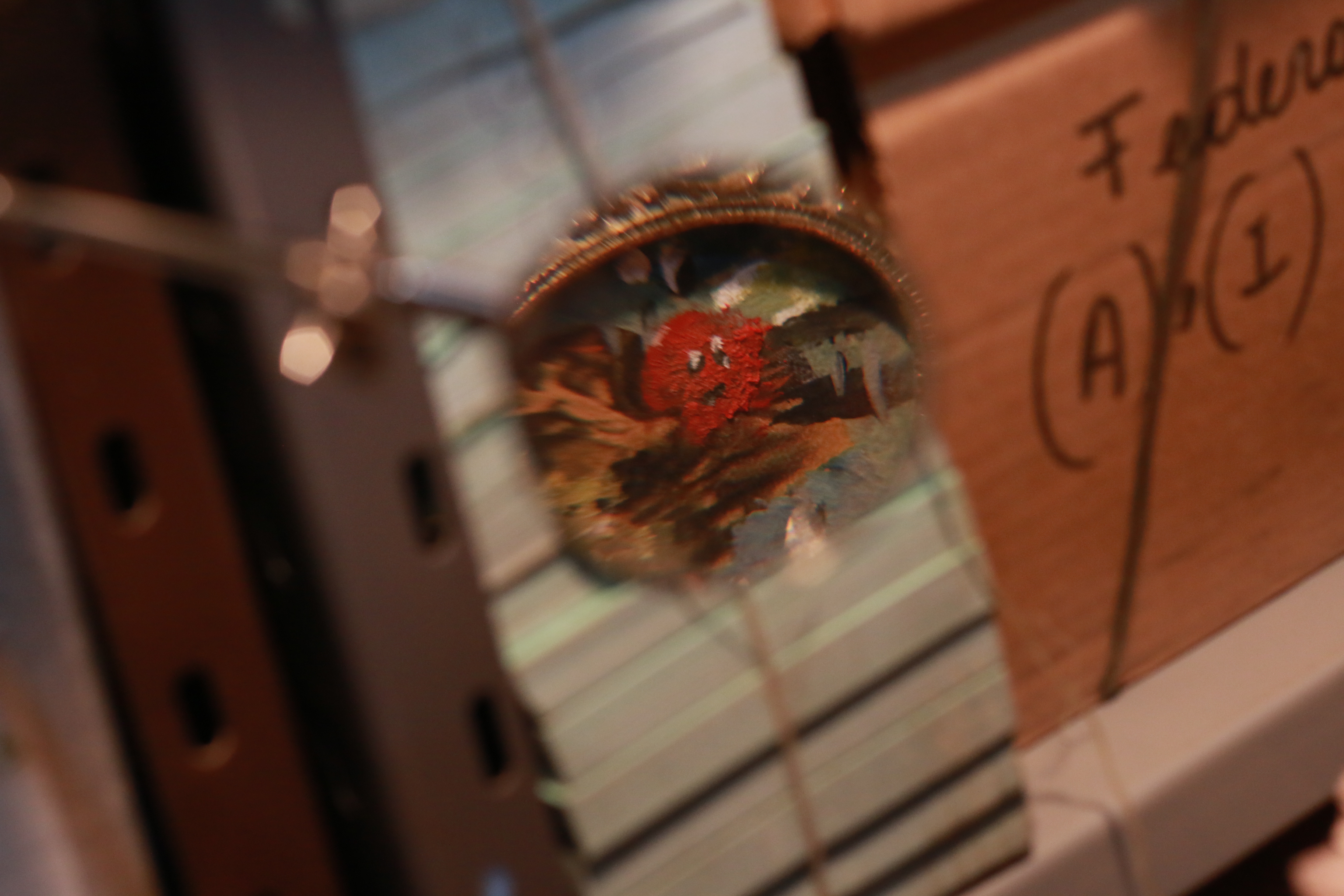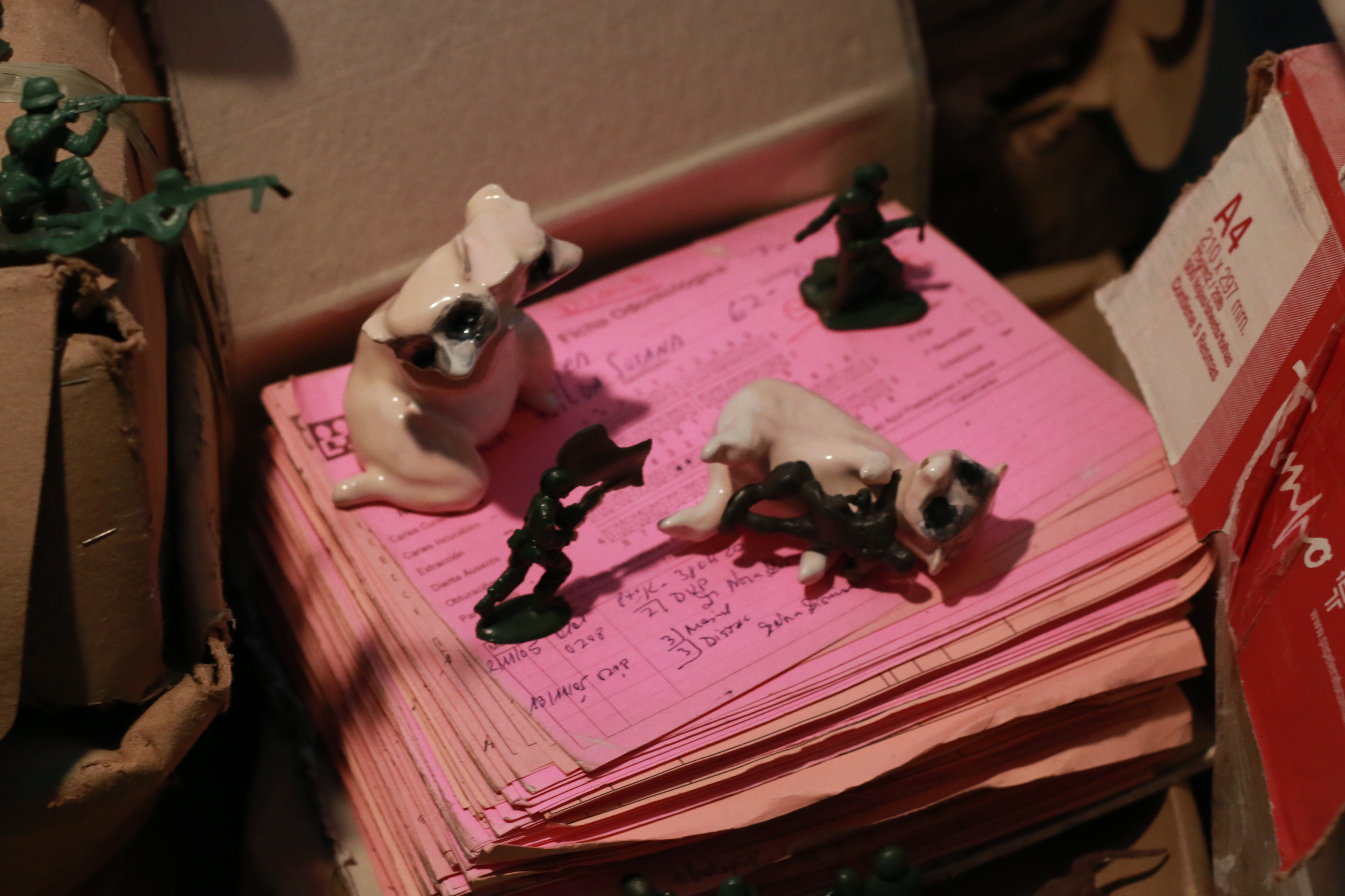 Entre el abigarramiento de cajas de cartón y vigas de madera, se instala un cuarto de observación pictórica en la última habitación de la casa. Espacio contemplativo, las pinturas cuelgan de las pilas de archivo a distintas alturas, como si trataran de hacerse iluminar por la cálida luz del cuarto. Dos paisajes llaman la atención: figurativos, componen una escena de una casa junto a una laguna. Evocaciones bucólicas de una Resistencia que no será. La pintura como grueso y estatuto sólo puede ser entendida en este espacio como un medio de placer y deseo. Su precaria, y por momentos violenta, materialidad se cuela entre la ruina del archivo como un deleite mundano, adopta el lenguaje cotidiano del goce de vivir rodeados por objetos bellos, sensibles, para desgarrarlo sin misericordia. Los pequeños trofeos que pueblan el perímetro de la pieza son un sardónico guiño a la abatida sensación de triunfo y satisfacción.