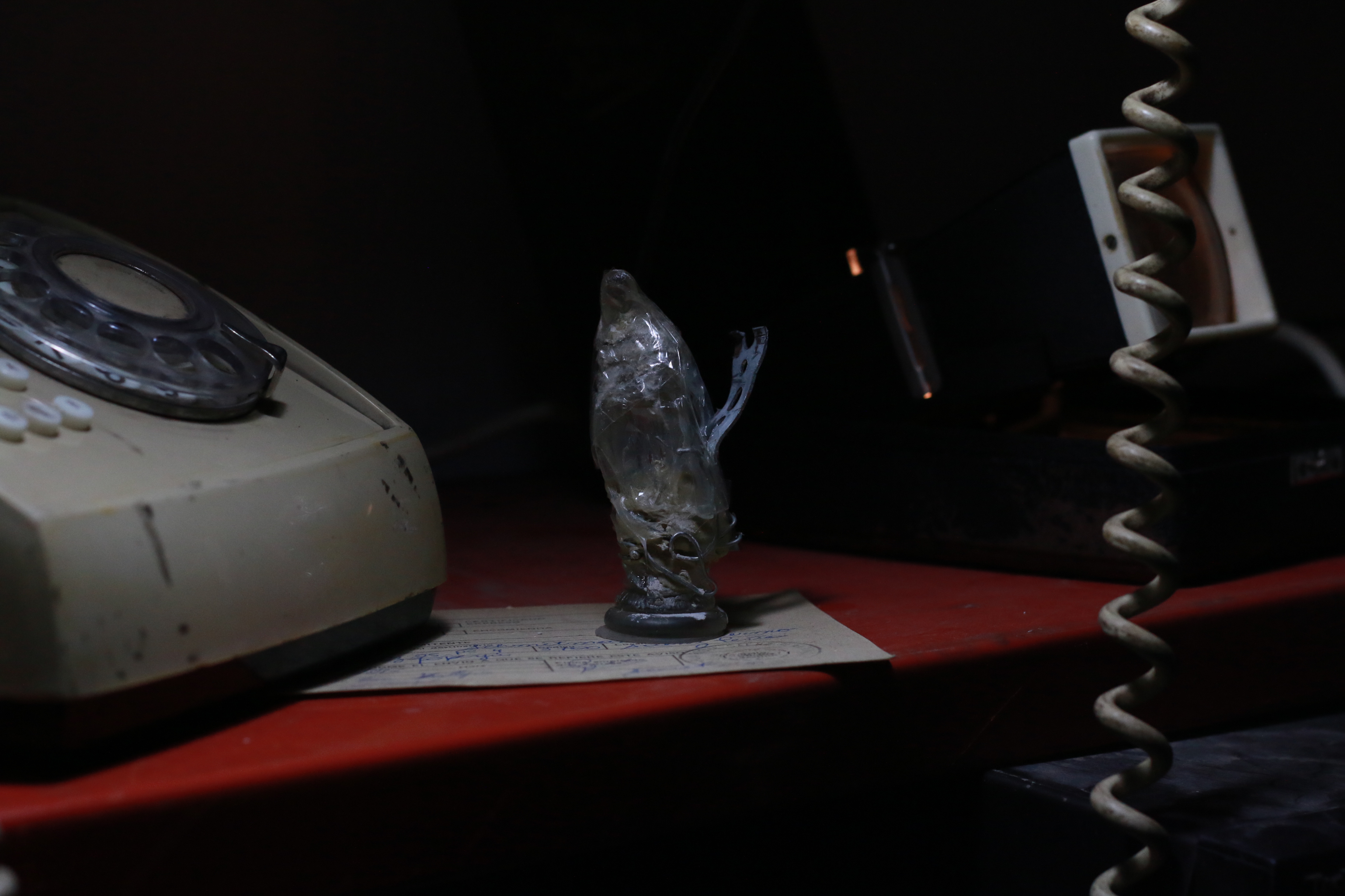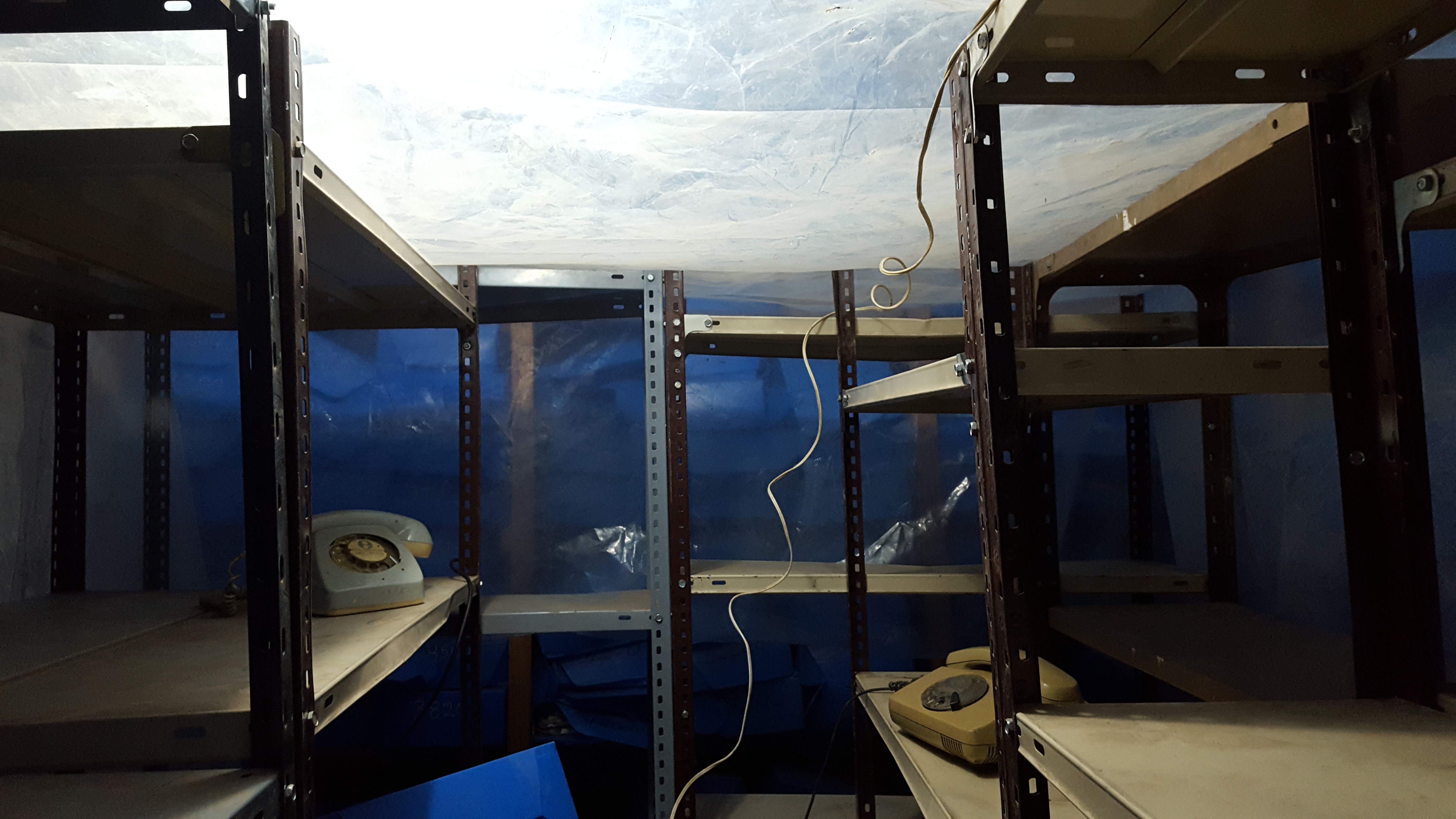 En la siguiente pieza, la estridencia y el misterio trastocan la estantería que soporta cajas azules de polipropileno. Al centro, una estructura metálica con forma de herradura es cubierta por un grueso plástico transparente. Adentro de la precaria construcción, cuatro teléfonos de disco repiquetean a destiempo, cada uno de ellos en momentos precisos. La composición sonora, a cargo de Cristian Cochia, invade el espacio con su aleatoriedad. la llamada no se concreta. No se sabe cuándo comenzará el sonido, ni cuándo parará. El interlocutor no es más que una construcción por parte de quien escuche el sonido del teléfono. Los mensajes languidecen dentro del invernadero, una redundancia y un excedente en las tierras calientes del Chaco.