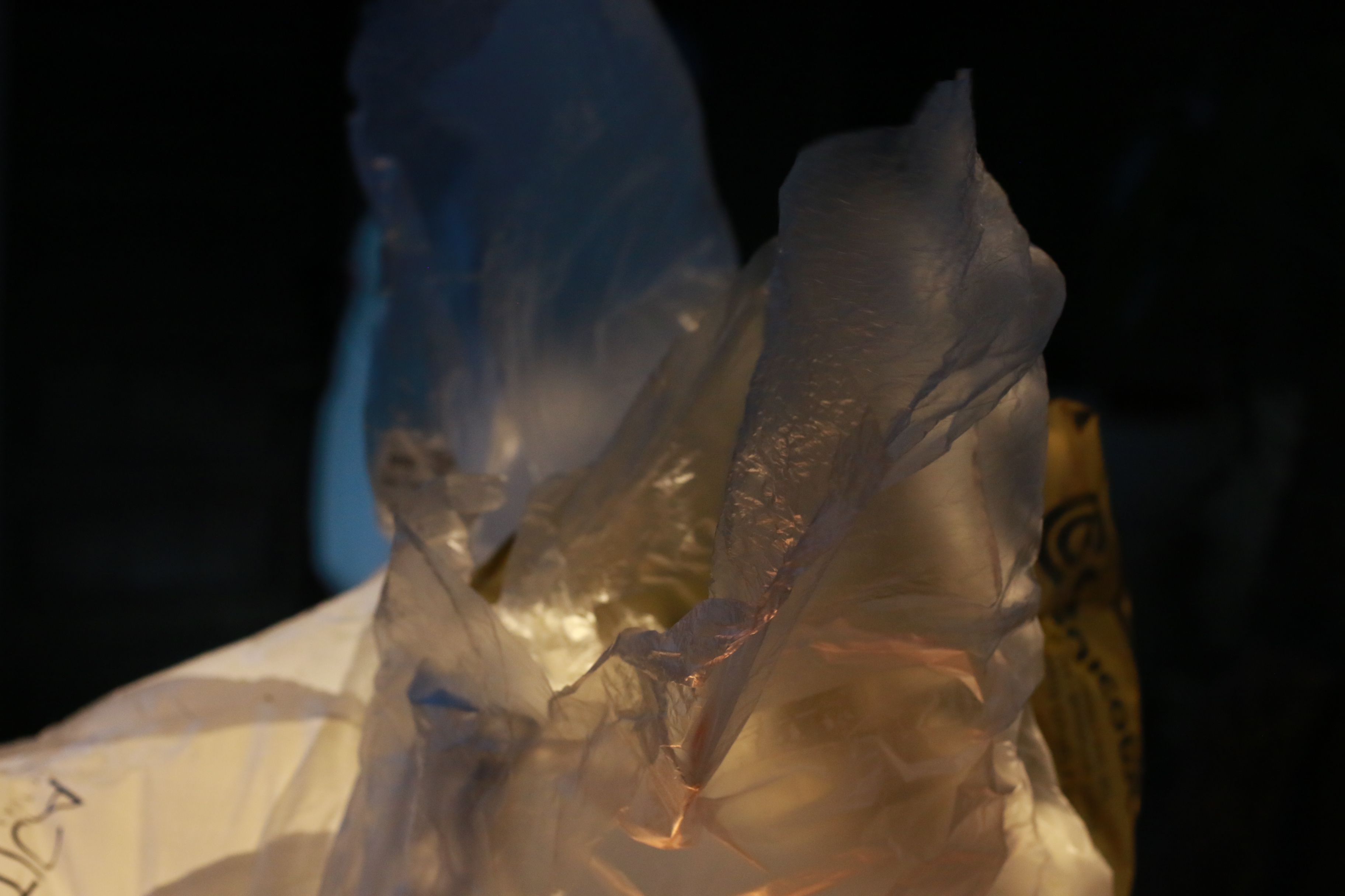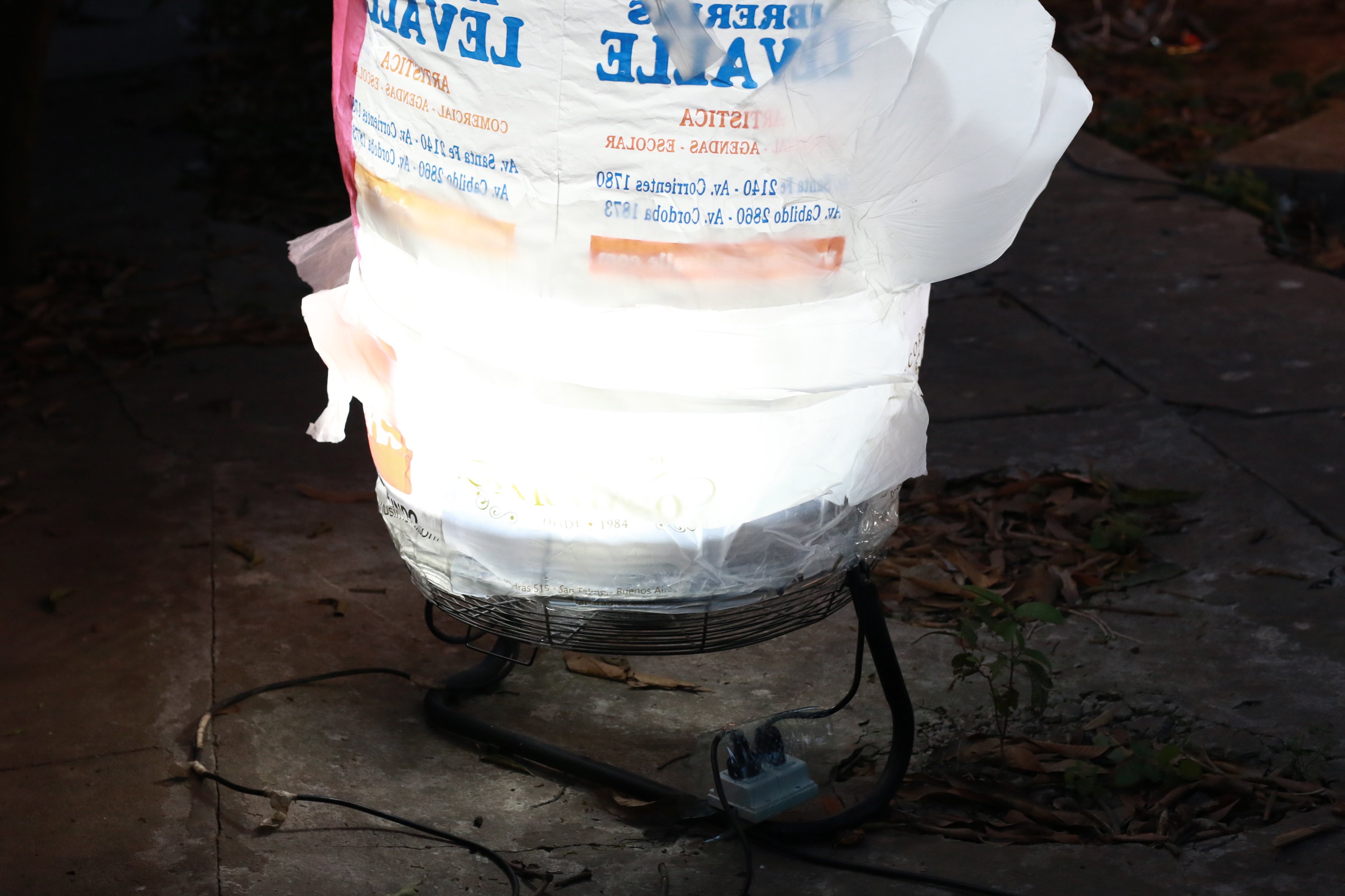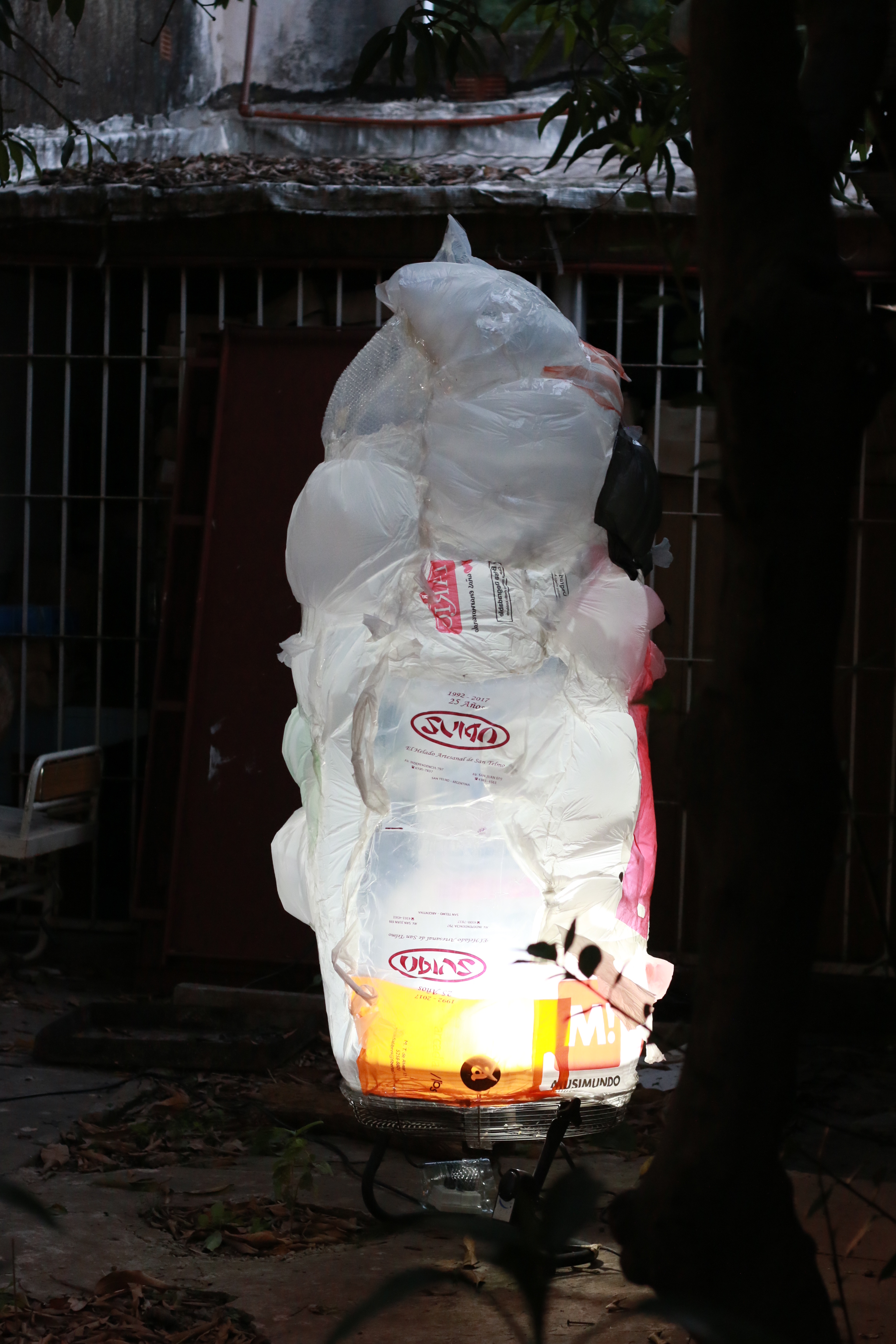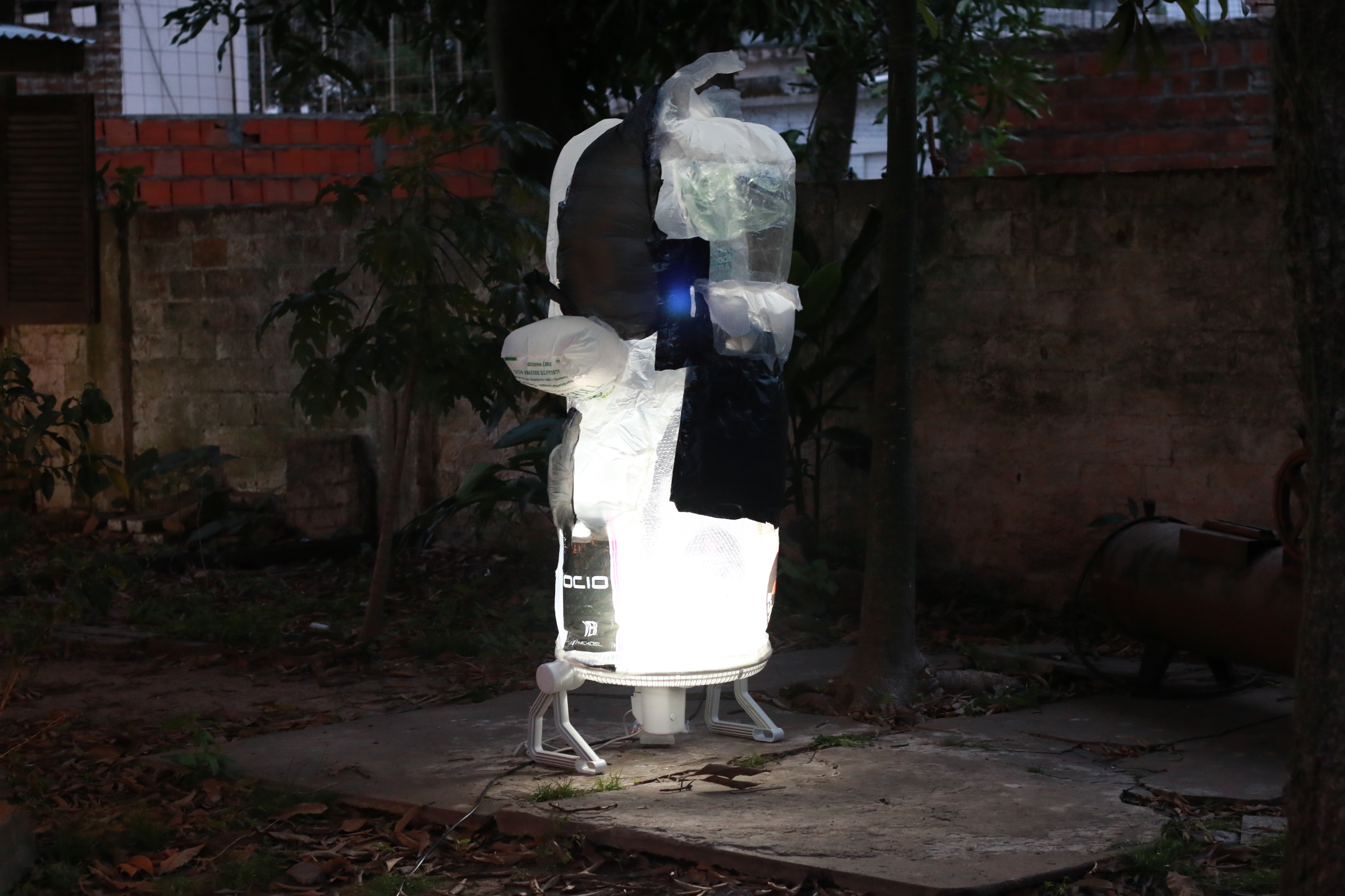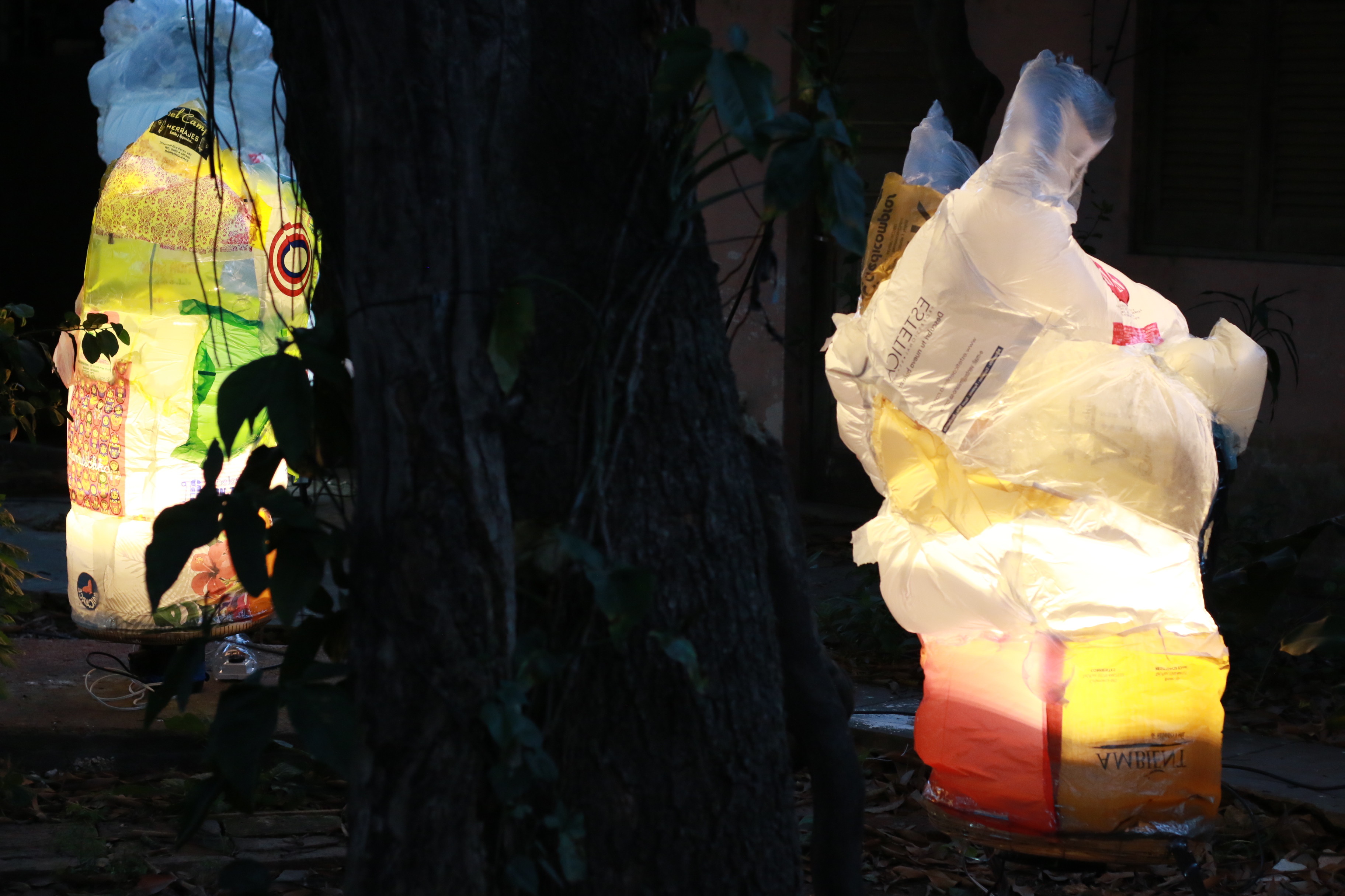 Lábile, sutiles, impolutas. Una serie de esculturas hechas de girones y rejuntes de bolsas de plástico danza hacia la noche en el patio trasero. Entre mangos y plantas tropicales de grandes hojas, la visión de las precarias piezas es solemne. Su espectral presencia corona la experiencia estética: el paisaje está en crisis, el relato se ficcionaliza a sí mismo, el fin del mundo no será breve ni vendrá pronto...
