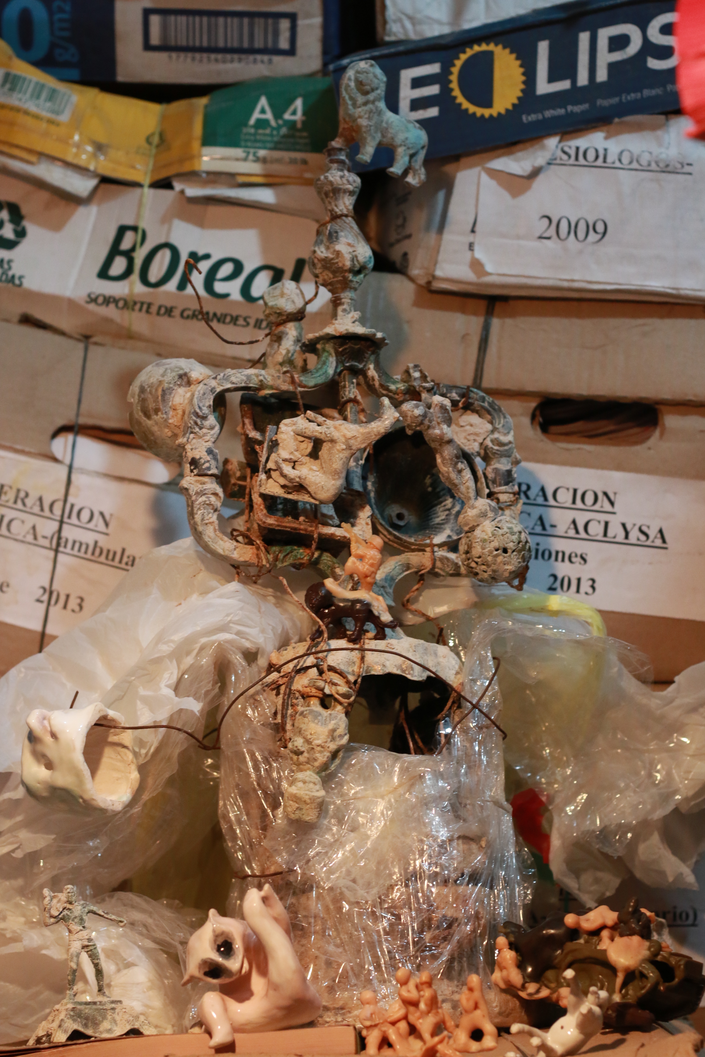 En un valle de cajas marrones, en la tercera habitación, especies pioneras, mutaciones y otros seres amorfos conforman una escena grotesca: los cuerpos escultóricos se reúnen alrededor de un árbol de navidad hecho de metal, plásticos y desperdicios. Mamíferos amamantando, lamiéndose los genitales y tirados sobre sus espaldas ensamblan una comunidad con masas plásticas de figurines militares y animales salvajes. La muerte y la vida palpitan contundente y estruendosamente en la distópica visión. Los soldados apuntan sus armas, mientras son devorados por voluptuosas carnosidades de plástico. Su formación dispara asociaciones inmediatas con las tradiciones y prácticas del catolicismo, así como con las representaciones occidentales de las natividades. El horror crepita y tiembla en las sombras que proyectan los cuerpos y, simultáneamente, se corroe con la sucia ternura que evocan los personajes.