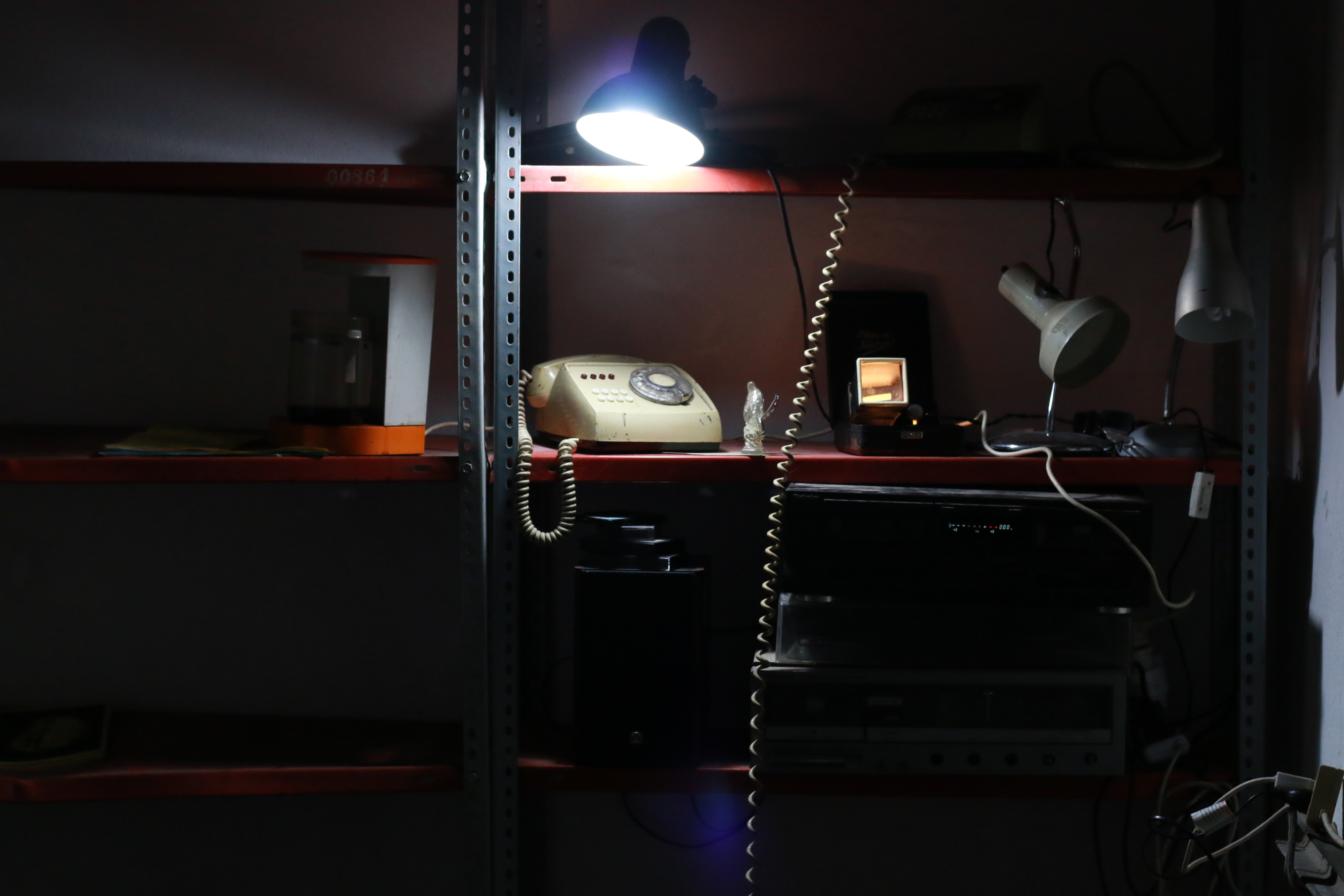 Countless boxes, made out of cardboard and plastic, lie next to scattered documents that overflow the space, while obsolete and forgotten objects build new walls using the metallic and wooden bookshelves that shield the perimeter of the rooms.