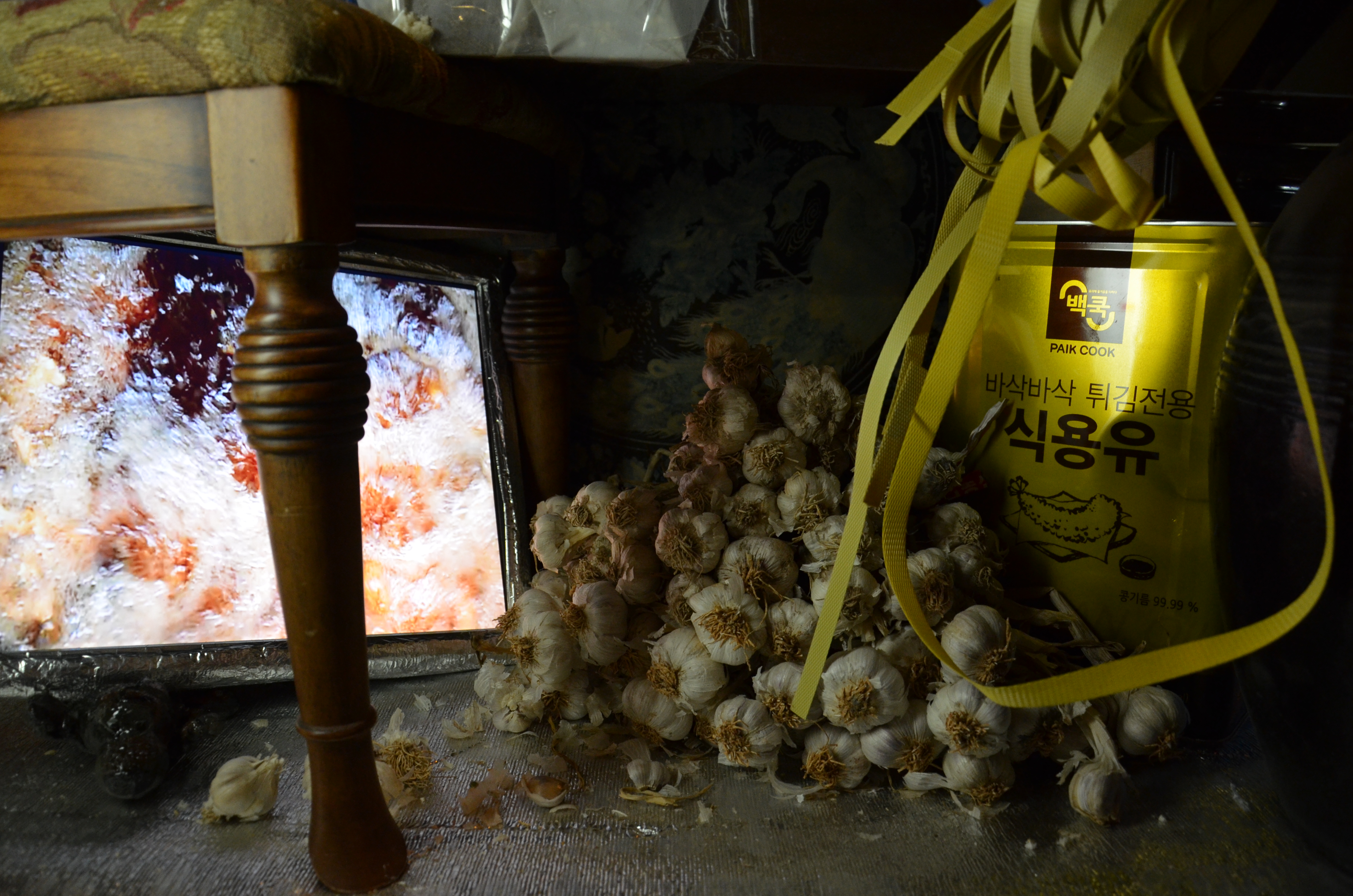 In the peripheric staircase, adjacent to the exhibition room of Barim, we installed an accumulation of objects and found forniture we gathered from areas of the town going through a process of gentrification to represent an atmosphere of decay and melancholy around South Korea’s past and traditions.