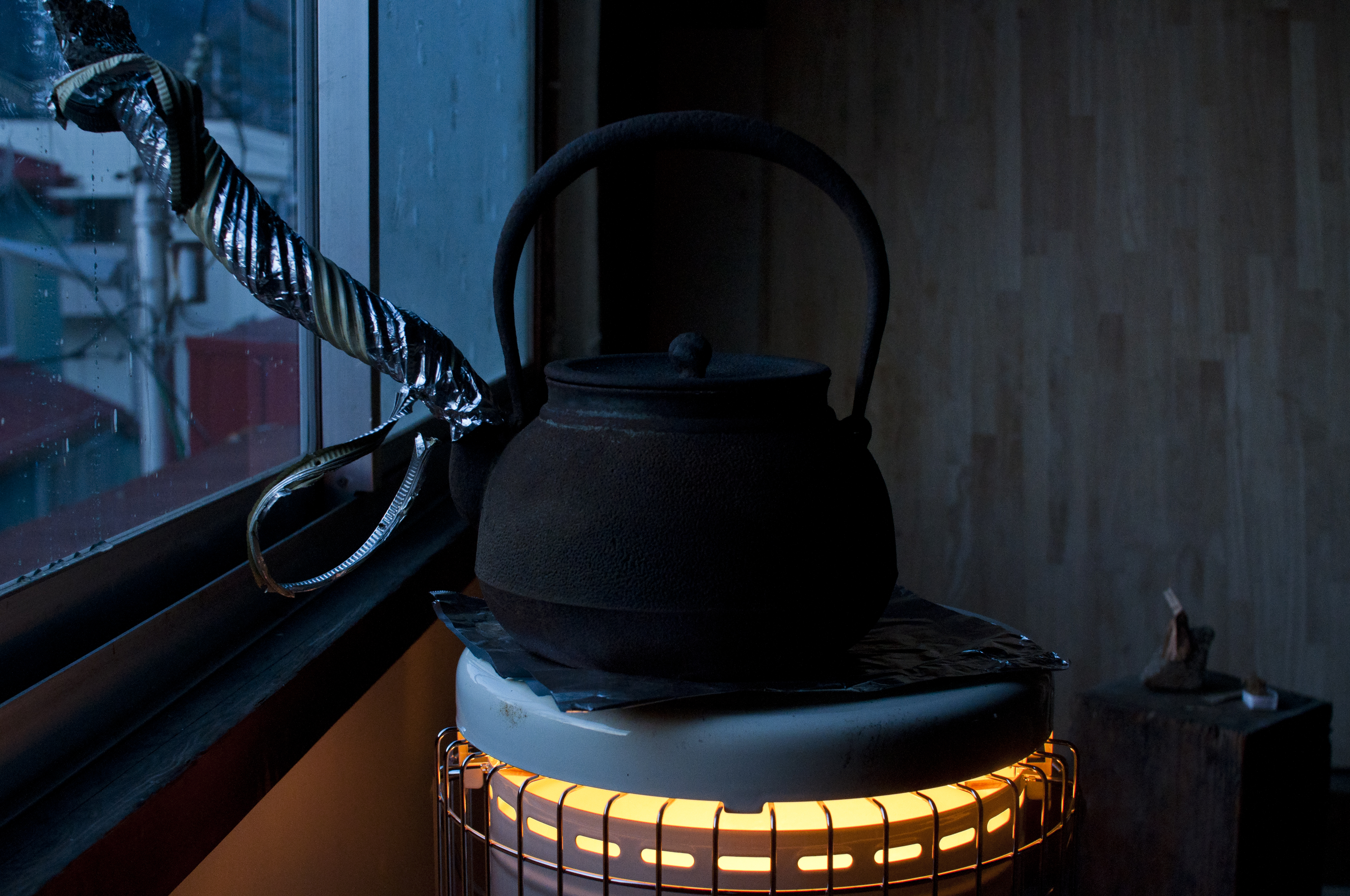 A painting on paper, hanged near the kerosene stove, illuminated from behind by a warm light with an old and dirty lightbulb. The stove and the painting were at the entrance. Some spectators didn’t visit the exhibition; instead, they prefered to stay warm by the fire, contemplating the painting, drinking warm sake. There, a communication took place, a shelter.